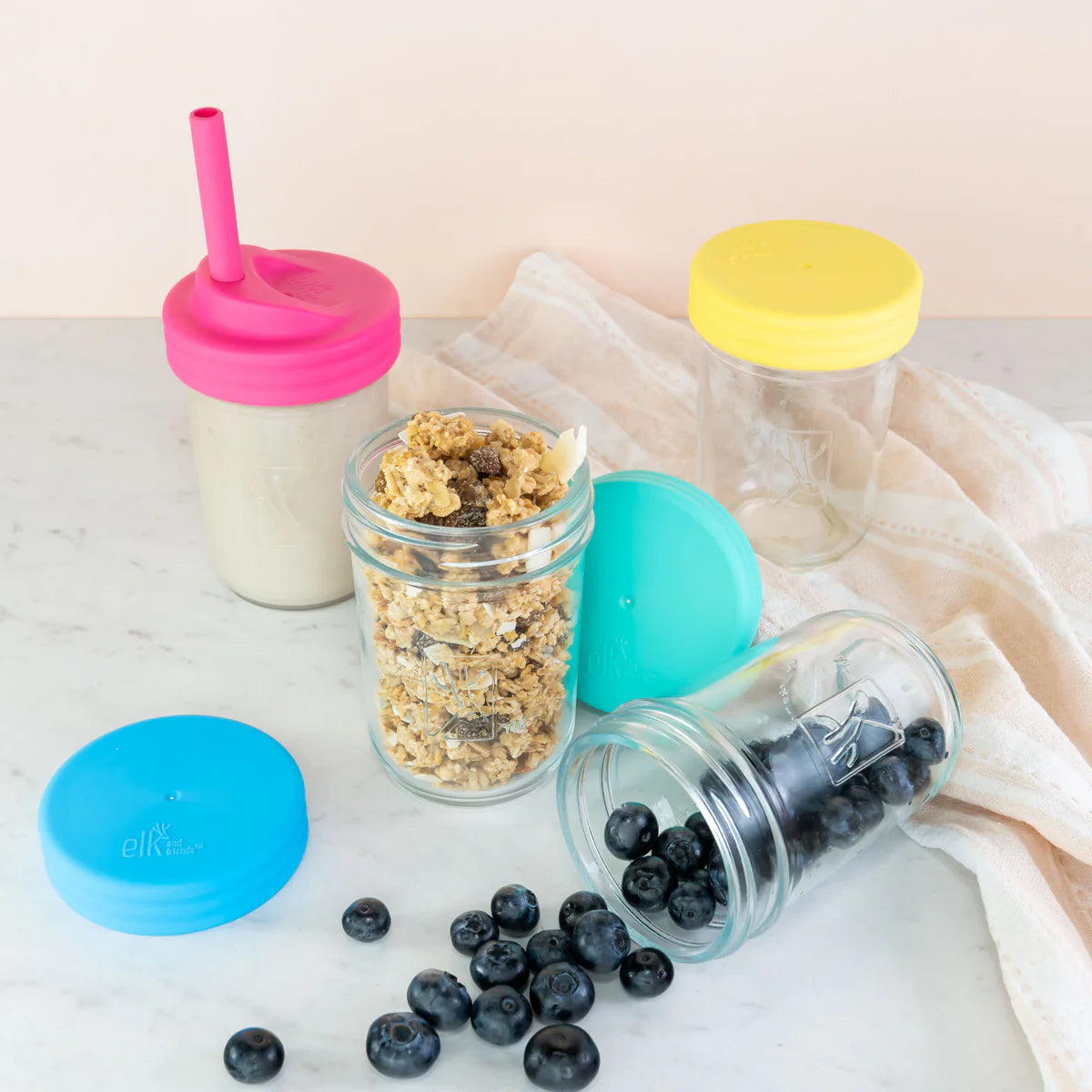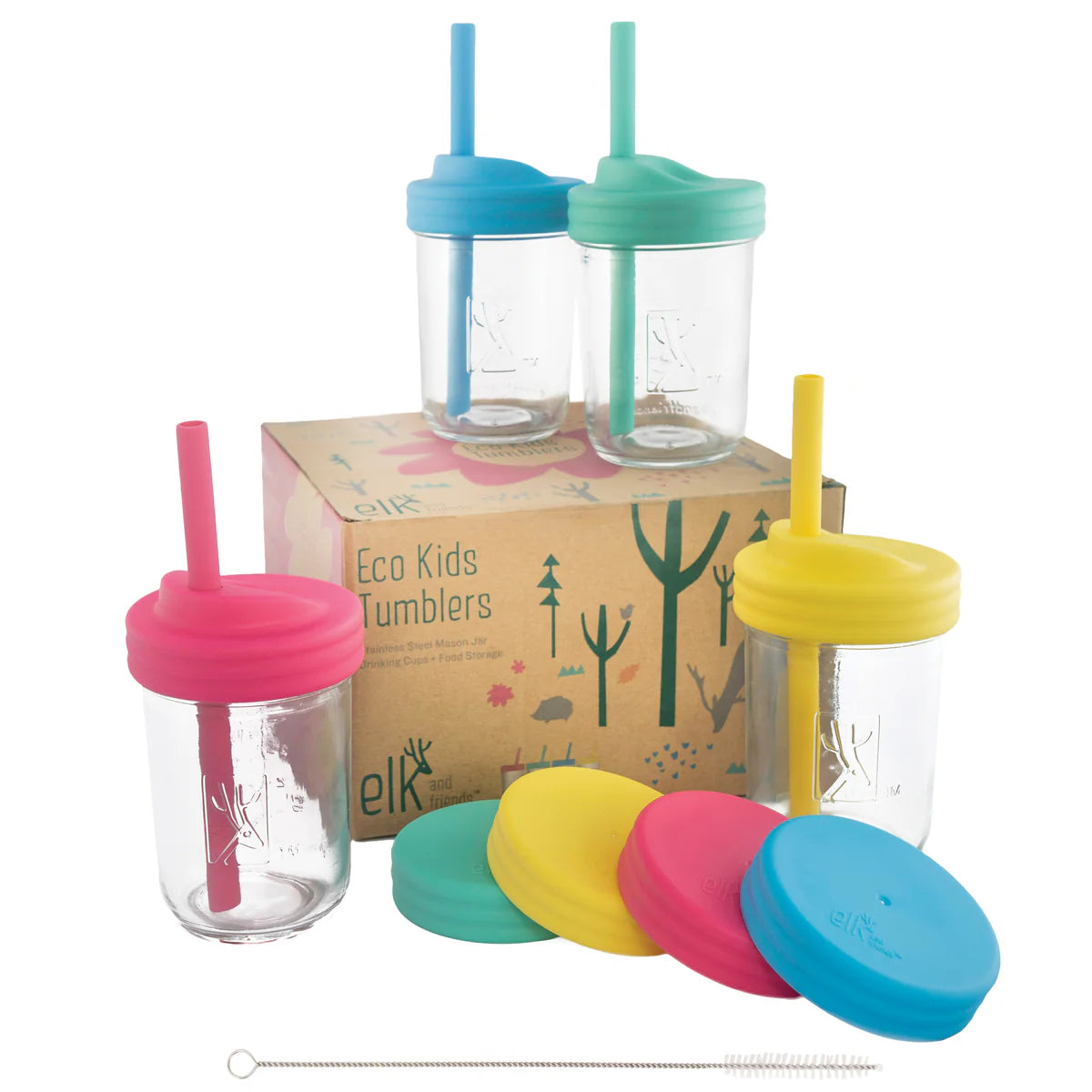 This set includes 4 * 8oz mason glass jars, 8 lids (4 Lids with straw hole + 4 * leak-proof & air-tight lids), straw cleaning brush and 4 silicone straws with stopper